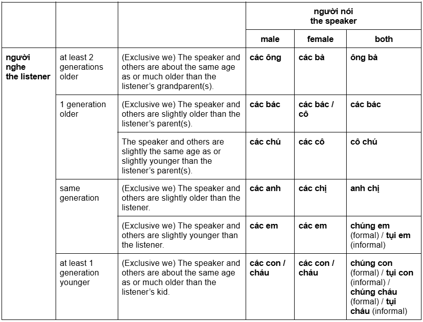 | First-Person Plural Vietnamese Pronouns | Inclusive we chúng ta | (used when speaking to peers of the same age) mình / chúng mình: neutral and polite tụi mình: casual and friendly |