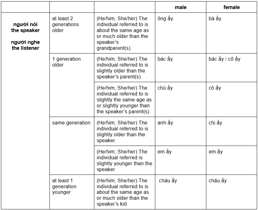 When it comes to third-person Vietnamese pronouns, you’ll notice something unique — many are actually Vietnamese kinship terms used to refer to people in an indirect but affectionate way. Instead of saying “he” or “she,” you might say “anh ấy” “chị ấy” “bác ấy” or “em ấy”.